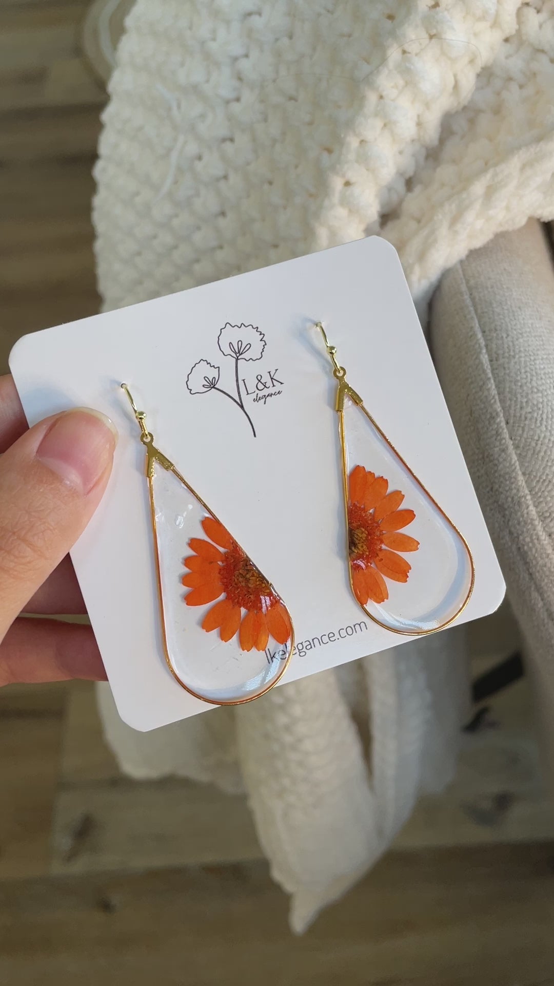 Orange Split Daisy Teardrop Flower Earrings, Pressed Wildflower Resin Earrings, Botanical Nature Jewelry Gift For Her