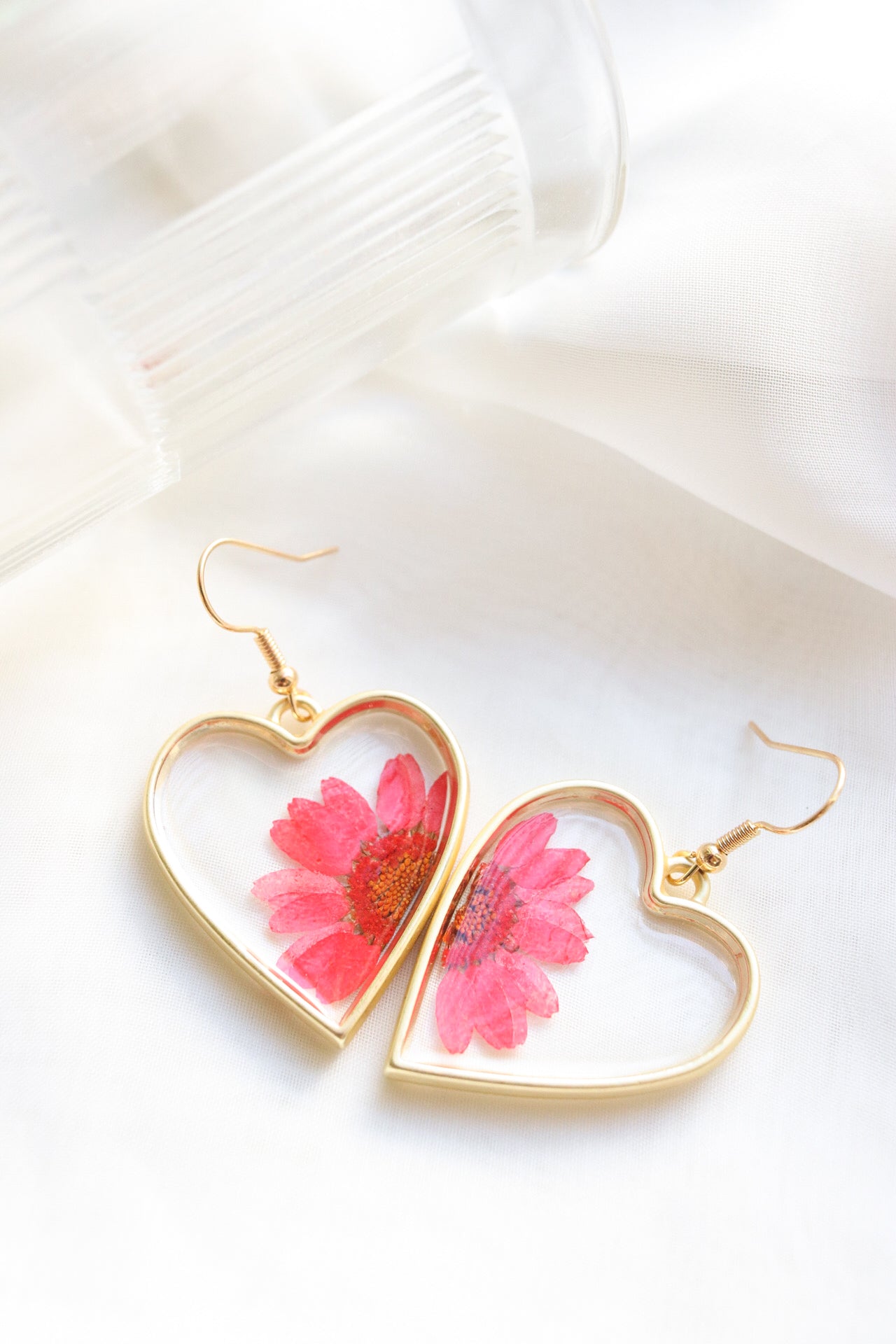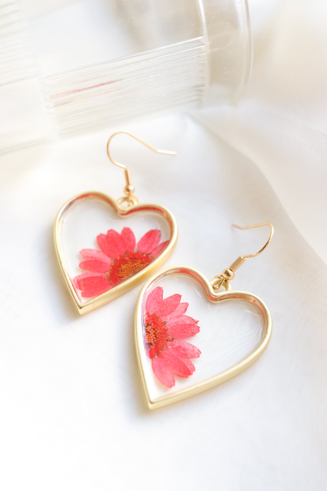 The Sweetheart is handmade from multiple thin layers of resin, beautiful red split daisy flowers in golden heart frames