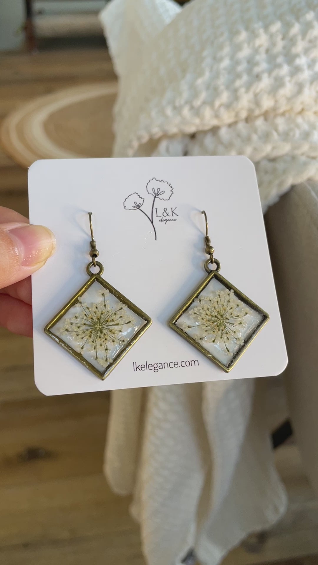 These classy vintage bronze handmade earrings are made from multiple thin layers of *premium resin and delicate white Queen Ann's Lace Flowers.